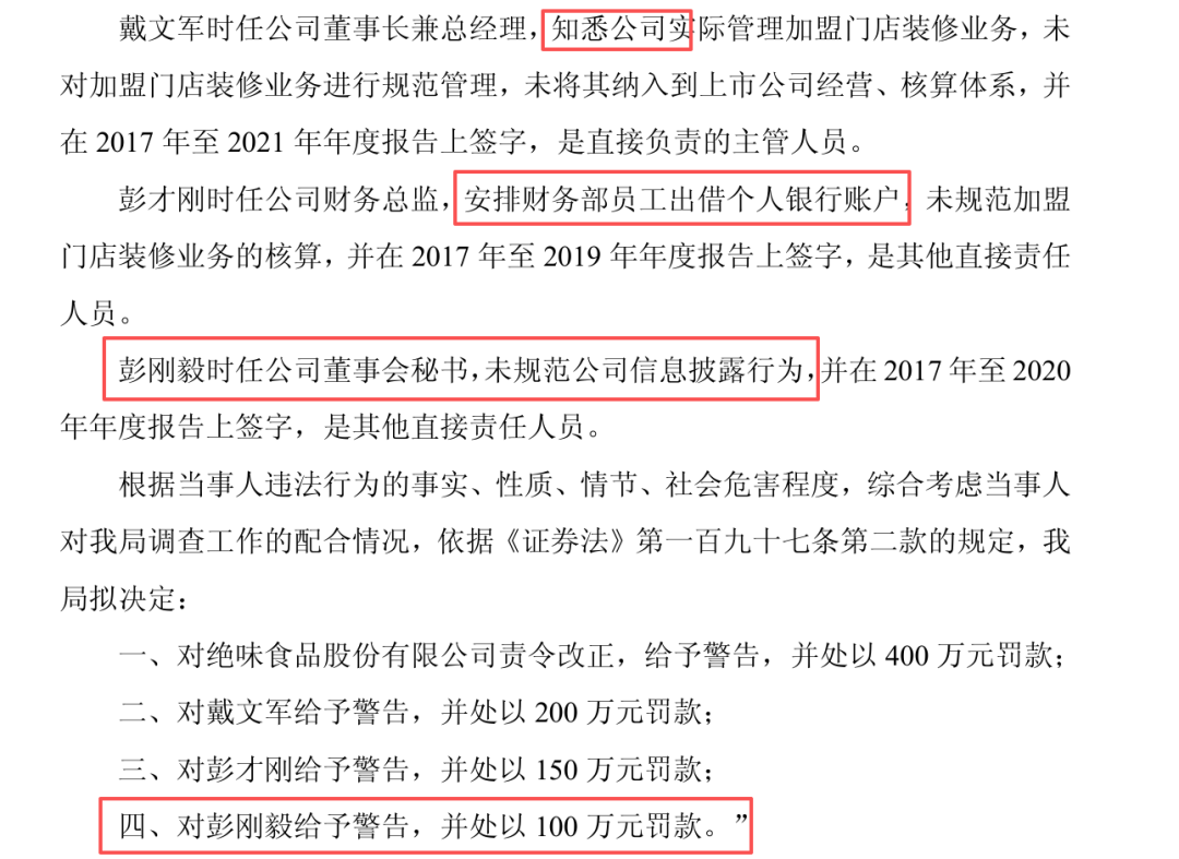 绝味食品这次也是罚了3个人:时任董事长兼总经理戴文军、时任财务总监彭才刚以及时任董事会秘书彭刚毅,其中董秘被罚了100万元,金额不小。