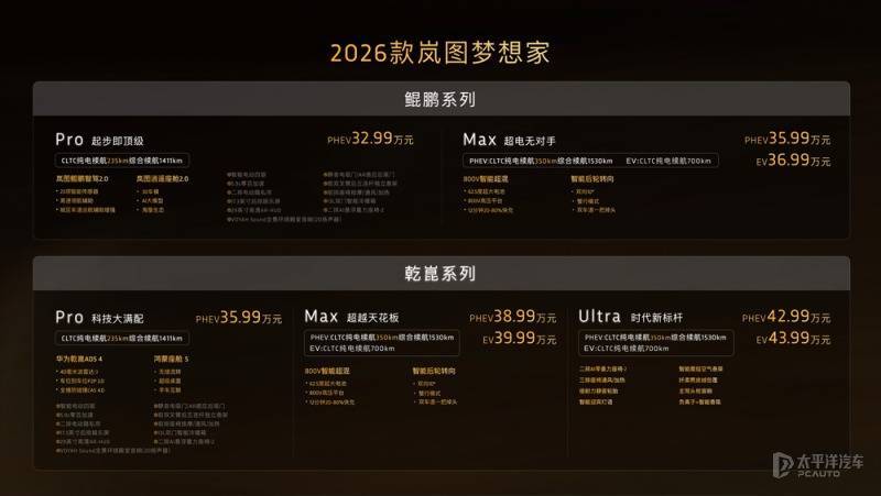 【太平洋汽车 行业频道】9月15日,2026款岚图梦想家正式上市,新车共推出7款车型鑫配资官网,官方价格区间为32.99-43.99万元。2026款岚图梦想家搭载华为乾崑智驾ADS 4与鸿蒙座舱5,并配备800V岚海智能超混系统,CLTC工况下纯电续航里程为350公里。